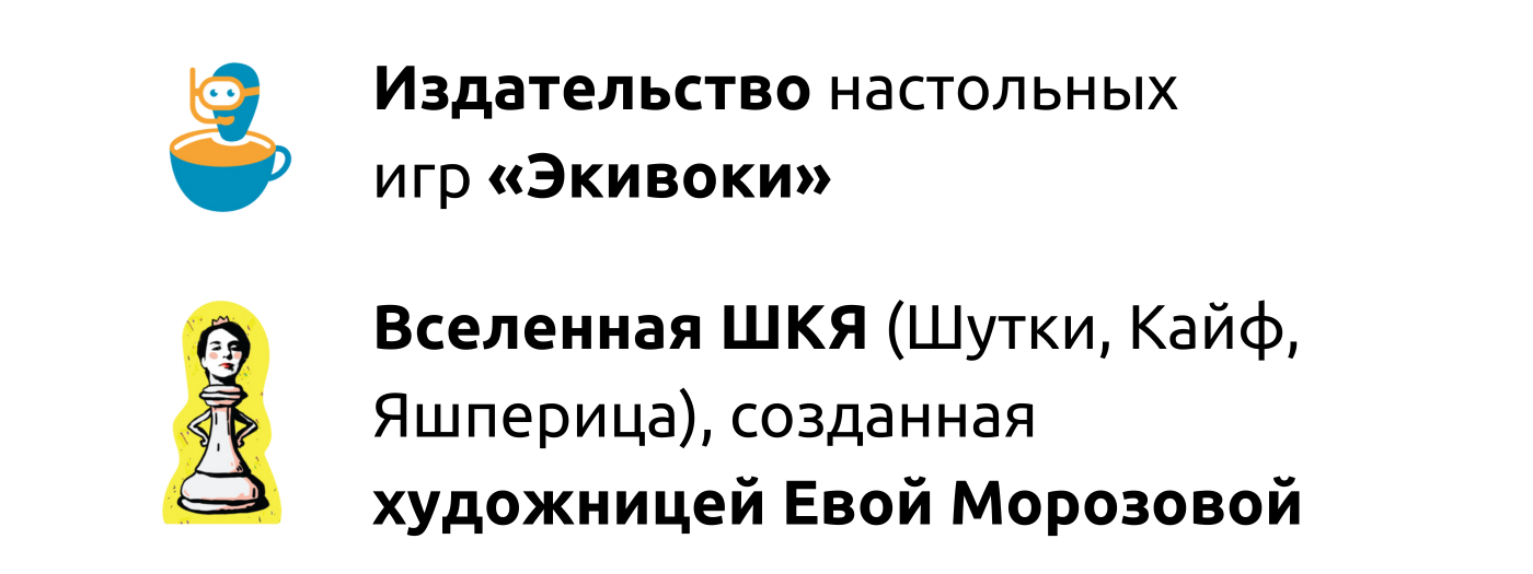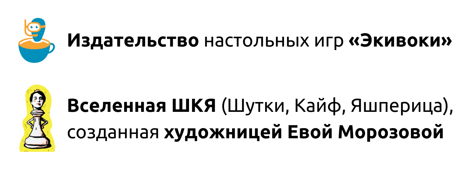ШКЯ (Шутки, Кайф, Яшперица) — это мир, созданный художницей Евой Морозовой: такой же смешной, ироничный и правдивый, как вселенная игры «Экивоки». Если вы тоже знаете и любите ШКЯ, обнимаем! А если нет, то скорее познакомьтесь с комиксами и мультиками Евы.